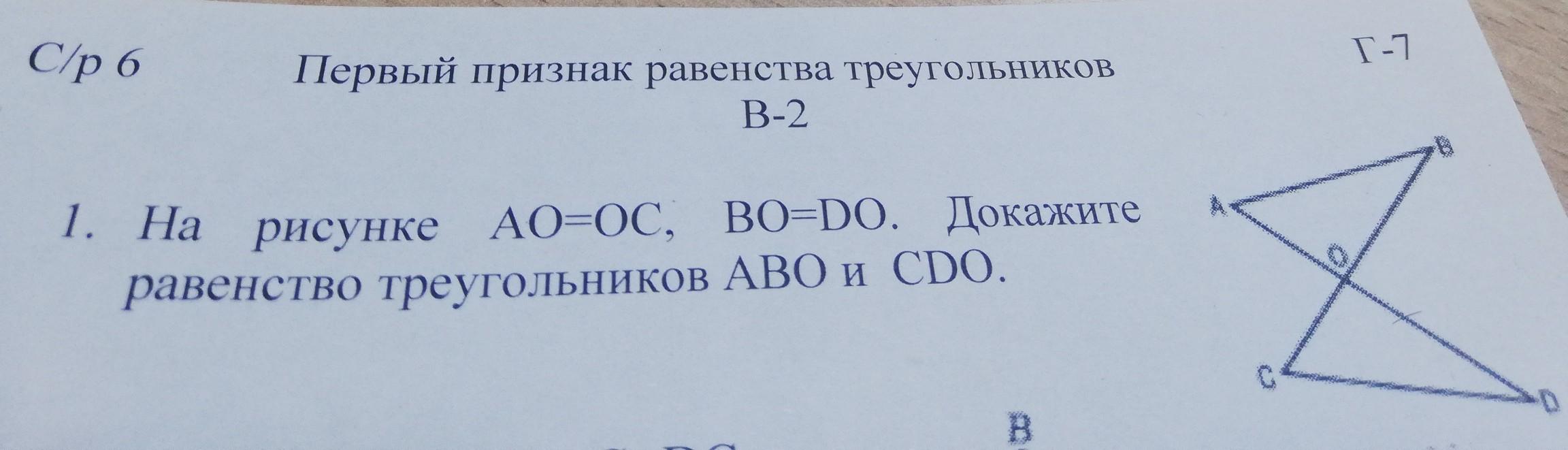 т.к AO=OС и ВО=ОD, а углы AOB и COD равны как вертикальные, следовательно треугольники равны по двум сторонам и углу между ними(1-ый признак)