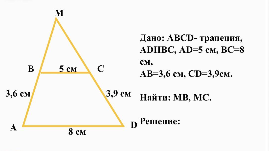 АD/ВС=(3,9+у)/у; 8у=5(3,9+у); 8у=19,5+5у; 3у=19,5; у=6,5. МС=6,5 см.