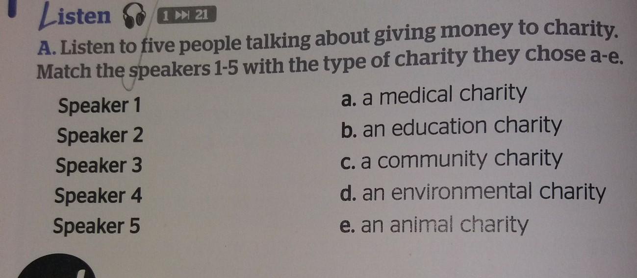 Listen »2 1 N 21 A. Listen to five people talking about giving money to charity. Match the speakers 1-5 with the type of charity they chose a-e.
