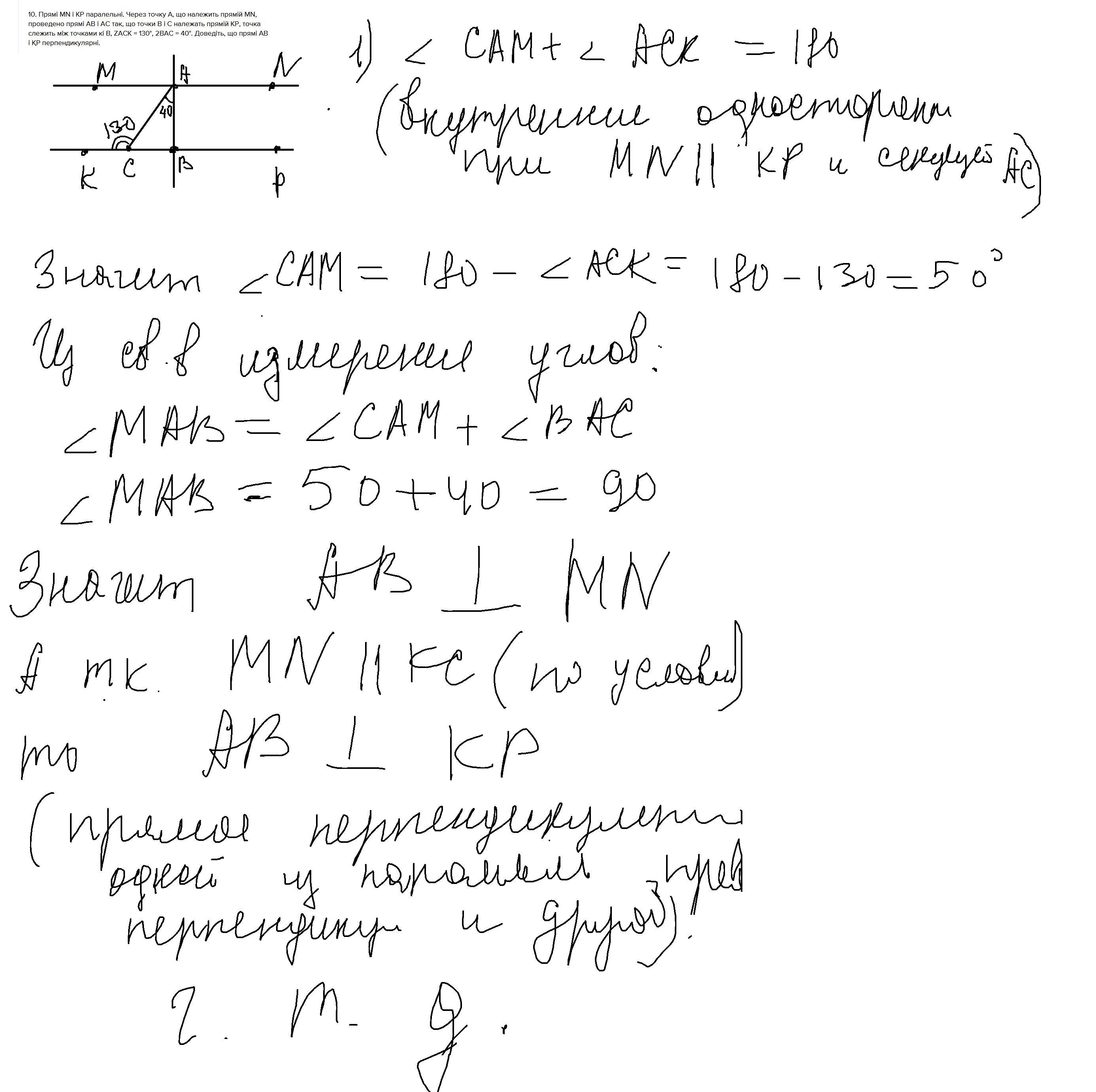 10. Прямі MN i КР паралельні. Через точку А, що належить прямій MN, проведено прямі АВ і АС так, що точки В і С належать прямій КР, точка слежить між точками кi B, ZACK = 130°, 2BAC = 40°. Доведіть, що прямі АВ і ҚР перпендикулярні.