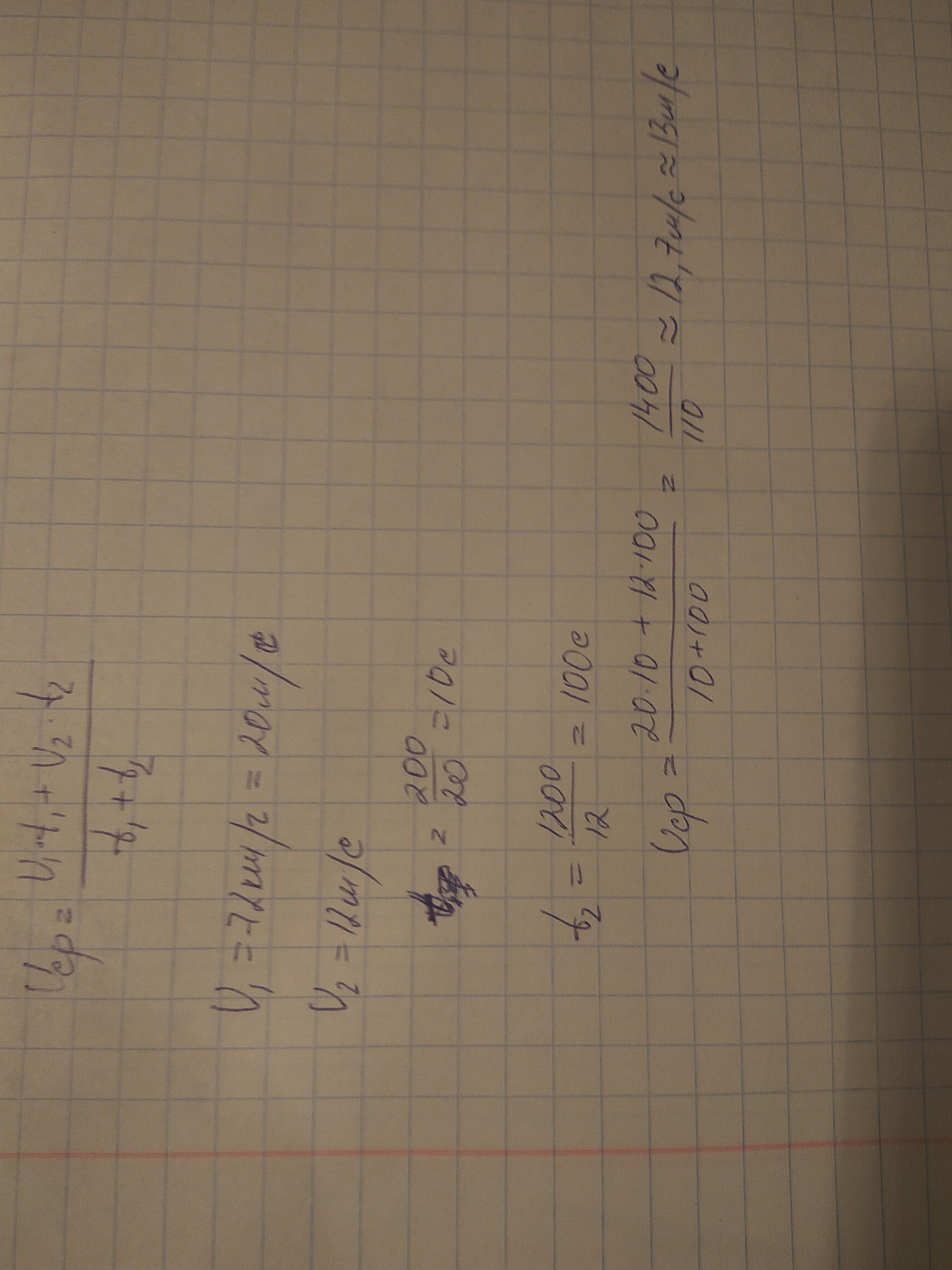 первые 200 м автомобиль проехал со скоростью 72 км/ч , а следующие 1,2 км - со скоростью 12м/с . Сему равна соедняя скорость движения