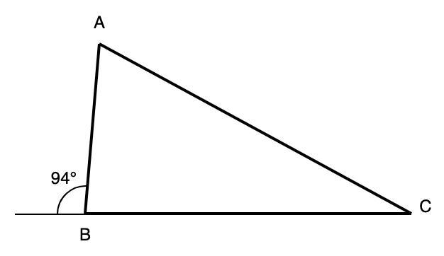 Пусть задан внешний угол при угле B треугольника. Тогда угол B равен: ∠B = 180° – 94° = 86°.