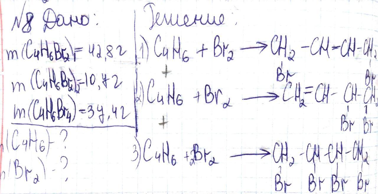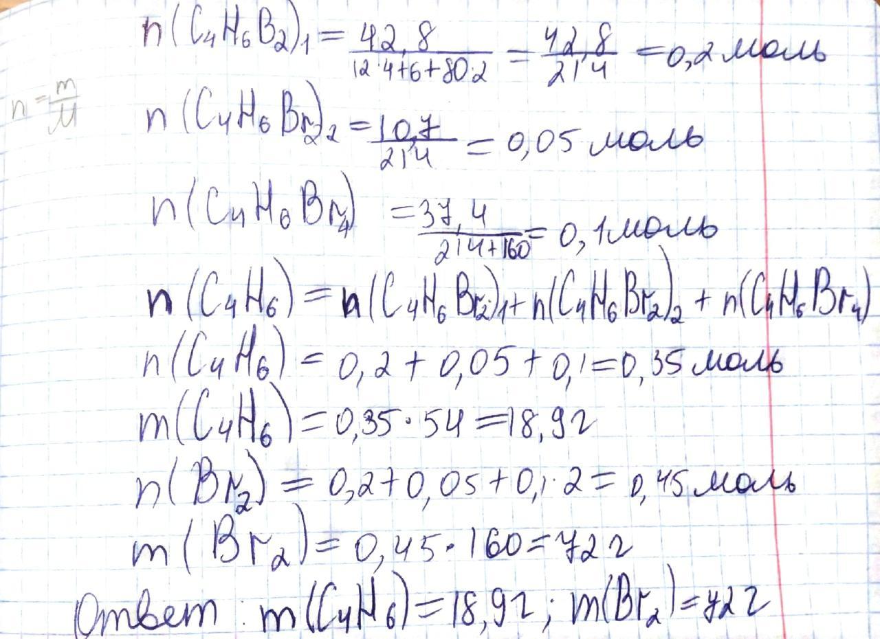 При реакции бутадиена с бромом образовалась смесь, содержащая 42,8 г 1,4-дибромбутена-2, 10,7 г 3,4-дибромбутена-1 и 37,4 г 1,2,3,4-тетрабромбутана. Рассчитайте массы бутадиена и брома, вступивших в реакцию.