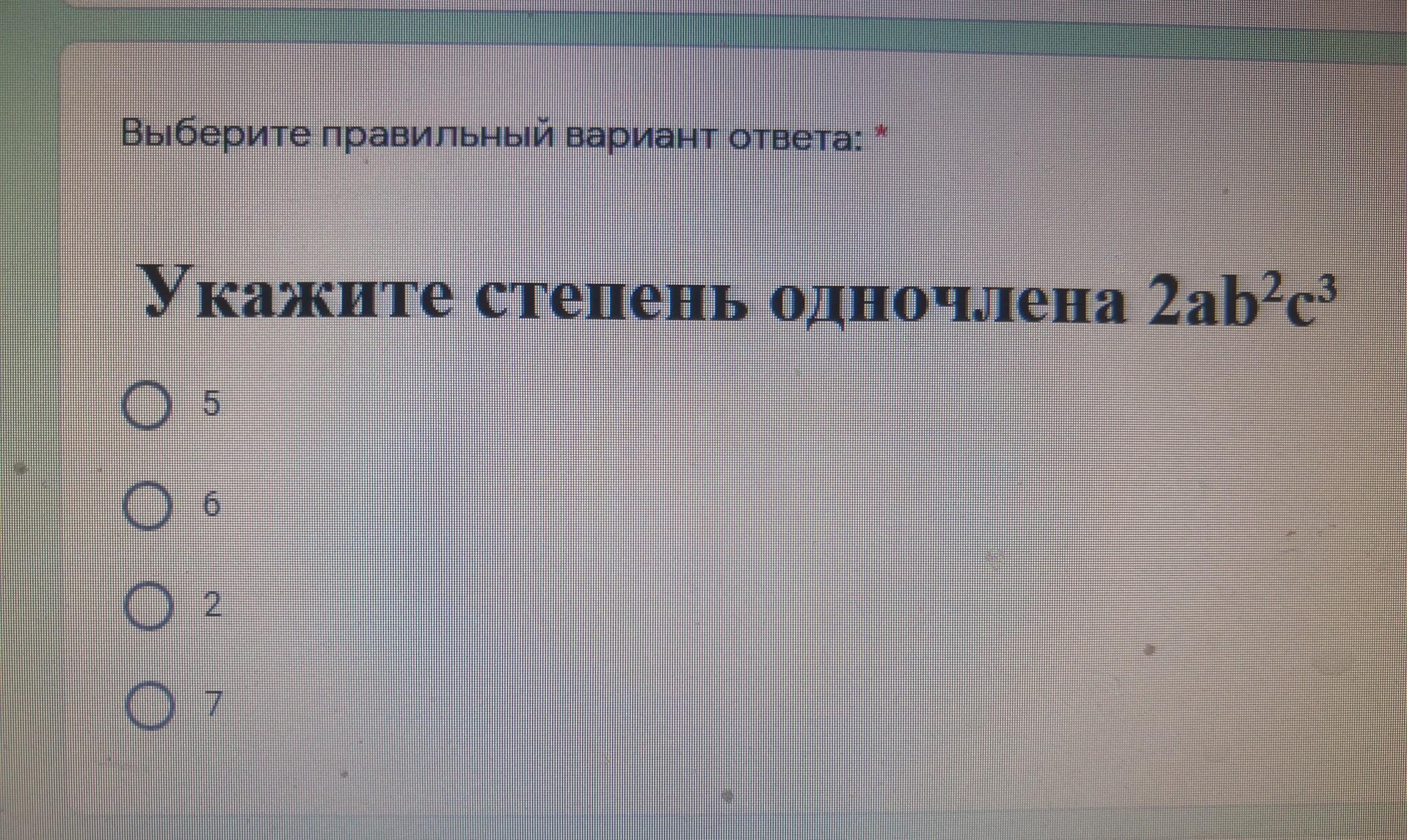 Например, степенью одночлена 2ab²с³является 6. Это потому , что переменная a имеет показатель 1 , переменная b имеет показатель 2 , переменная c имеет показатель 3 . Отсюда 1 + 2 + 3 = 6. Показатель числового сомножителя 2 считать не нужно, поскольку нас интересуют только показатели переменных.