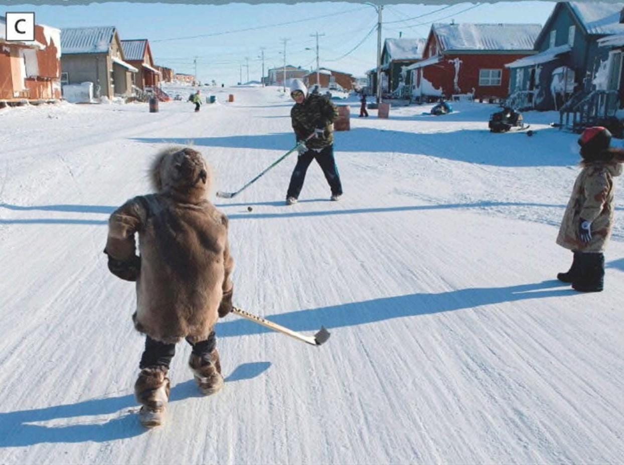 the painting shows three people, two boys play hockey and the third is a boy or a girl because they are not visible looking.