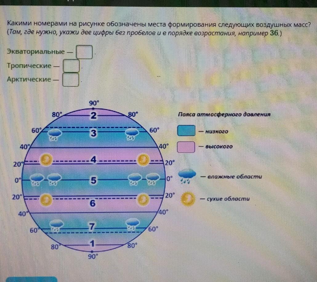 СРОЧНО!ГЕОГРАФИЯ какими номерами на рисунке обозначены места формирования следующихивоздушных масс.