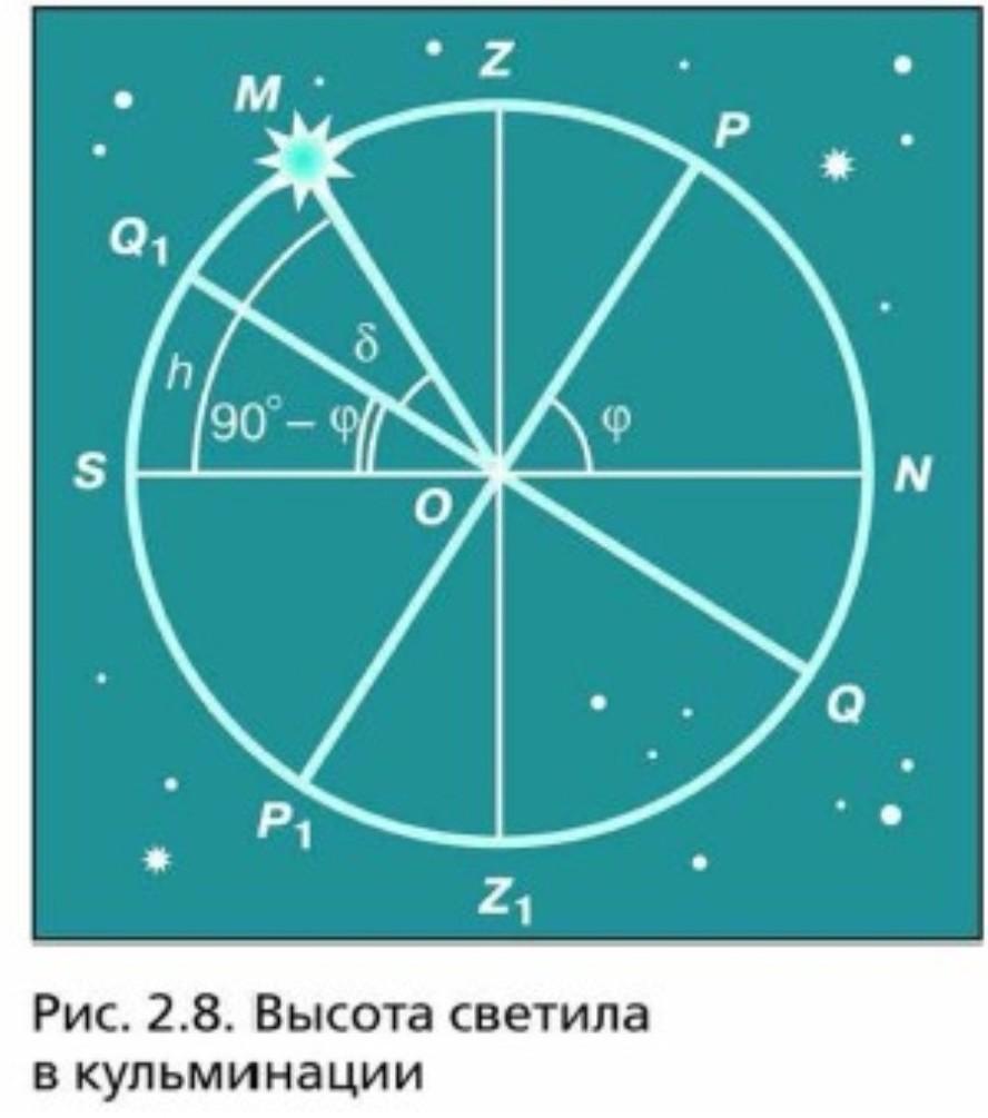Объяснение: Обе формулы, приведенные Вами, верны. А разница состоит в том, что первая формула h = 90° – δ + φ определяет высоту светила над горизонтом в момент верхней кульминации к СЕВЕРУ от зенита. Т.е. определяет угол между направлением на светило и горизонтом в северном направлении (в направлении N). Вторая формула h = 90° – φ + δ позволяет найти высоту светила над горизонтом в момент верхней кульминации к ЮГУ от зенита. На рисунке как раз и изображено такое положение светила, которое находится левее полюса Мира Р. Вот если бы светило М поместили бы правее северного полюса Мира, то высоту кульминации надо было бы искать по первой формуле. Впрочем можно искать высоту кульминации по любой формуле. Только надо учитывать, что по одной формуле высота будет меньше 90 градусов, а по другой формуле больше 90 градусов. Это так же видно на рисунке. К югу от зенита высота светила М меньше 90 (угол МОS) , а к северу от зенита высота светила больше 90 градусов (угол МОN).