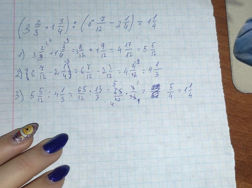 =(3 8/12+1 9/12):(6 7/12-2 3/12)=5 5/12:4 1/3=65/12*3/13=65/52=1 13/52=1 1/4