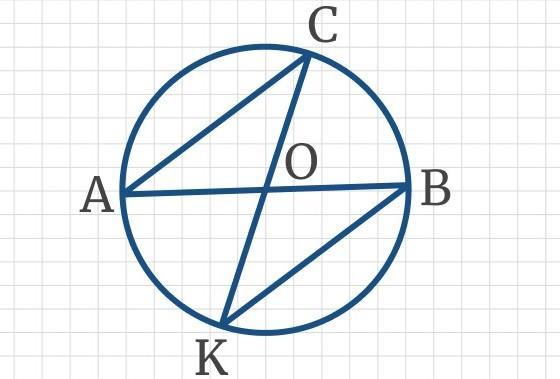 Так как О – центр окружности, то точка О делит диаметры пополам, следовательно отрезки АО, ОВ, ОС, ОК равны. ∠СОА = ∠КОВ (как вертикальные). Поэтому треугольники АОС и ОКВ равны по первому признаку равенства треугольников (по двум сторонам и углу между ними).
