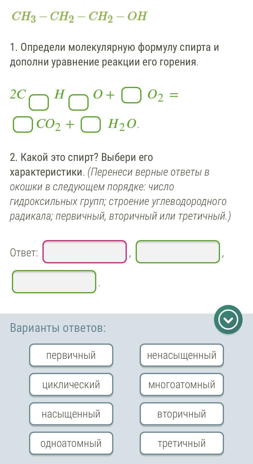 Определи молекулярную формулу спирта и дополни уравнение реакции его горения. Какой это спирт? Выбери его характеристики.