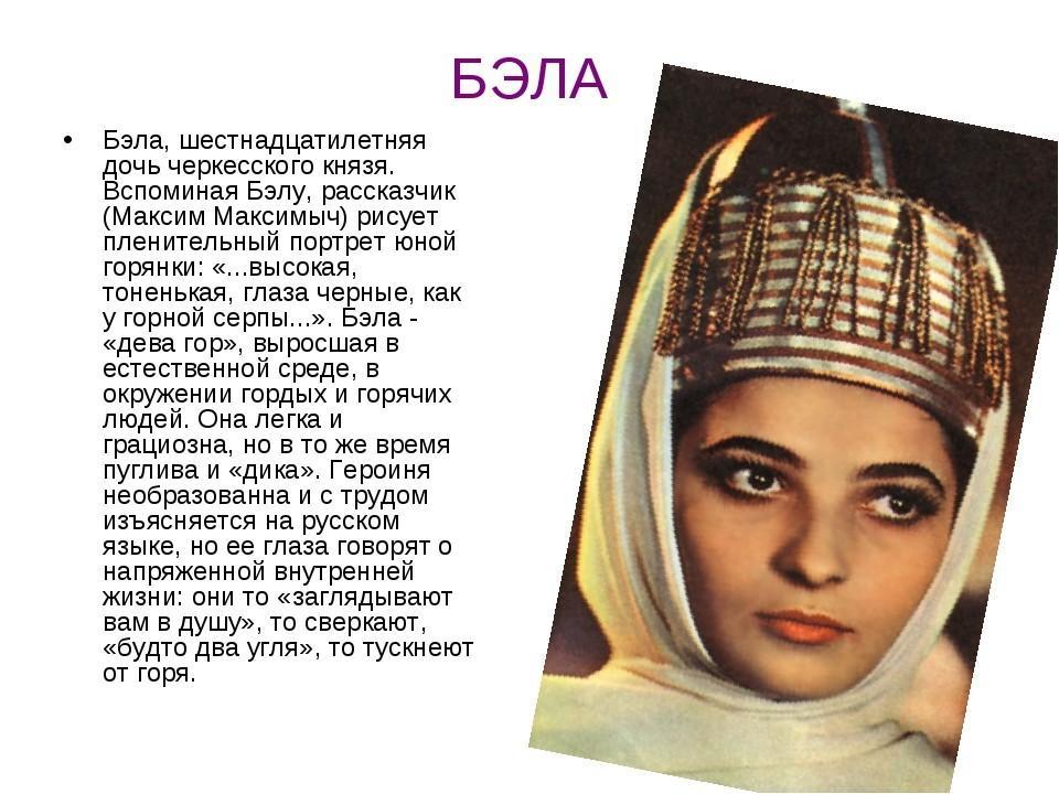 Бэла — младшая дочь черкесского князя. Героине 16 лет, она хороша собой, высокая и тонкая, с черными волосами и большими черными глазами.