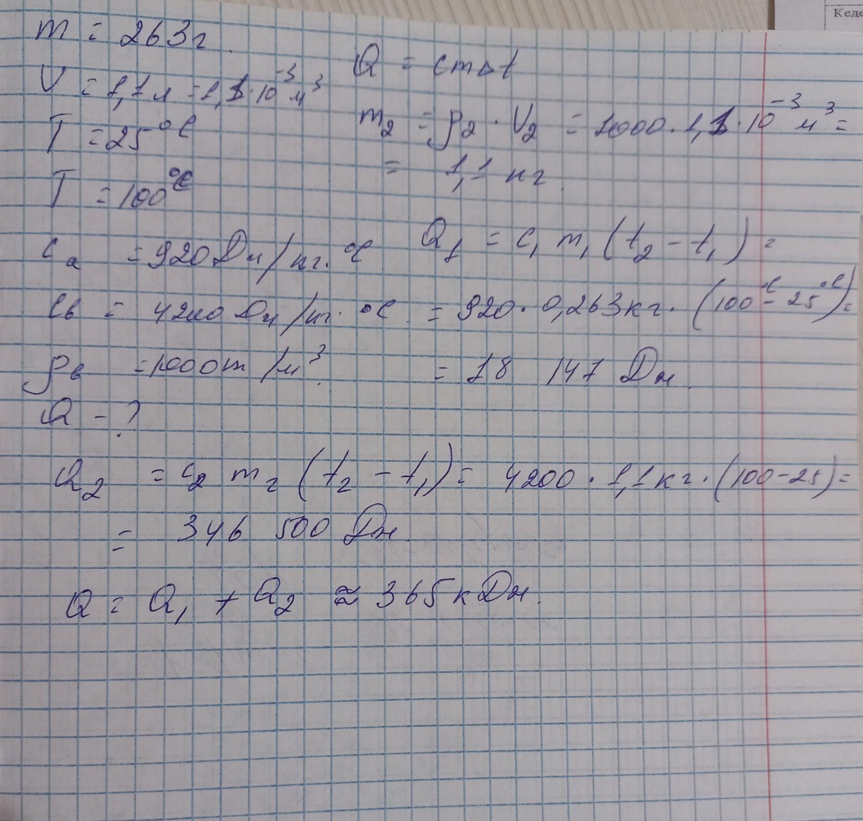 Определи, какое количество теплоты получили алюминиевая кастрюля массой 263 г и находящаяся в ней вода объёмом 1,1 л при нагревании от 25°C до кипения при температуре 100°C. Удельная теплоёмкость алюминия равна 920 Дж/(кг·°C), удельная теплоёмкость воды — 4200 Дж/(кг·°C), плотность воды — 1000 кг/м³.