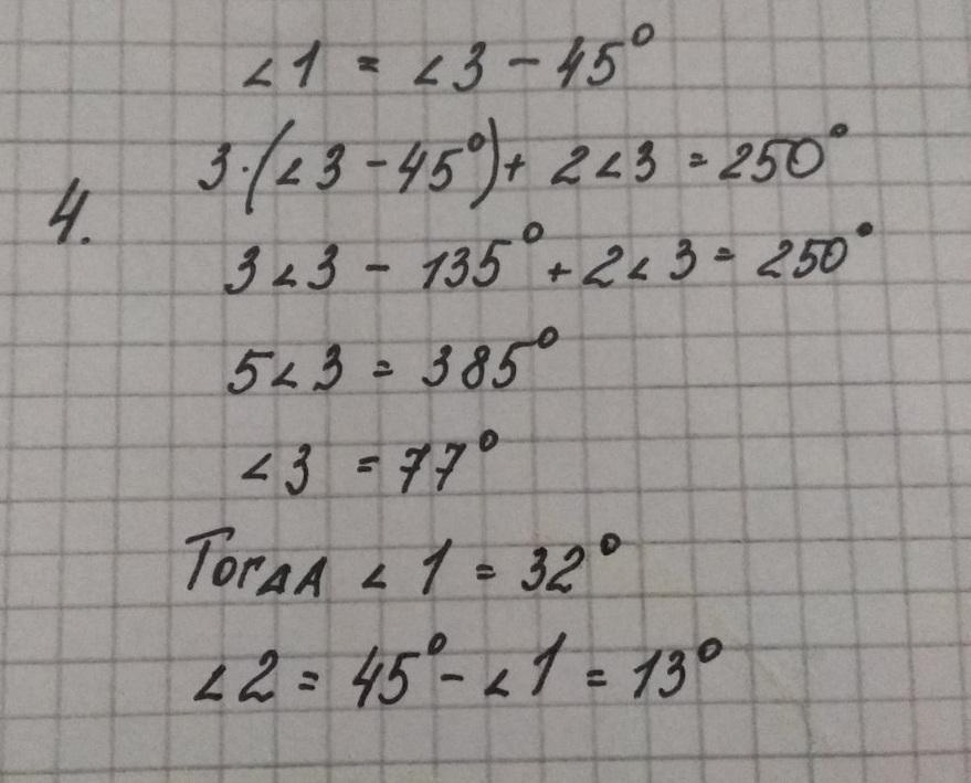 в прямоугольном треугольнике катет,лежащий против угла 30 градусов = половине гипотенузы. Отсюда следует, что угол 2 = 30 градусов, угол 1 = 45-30=15 градусов