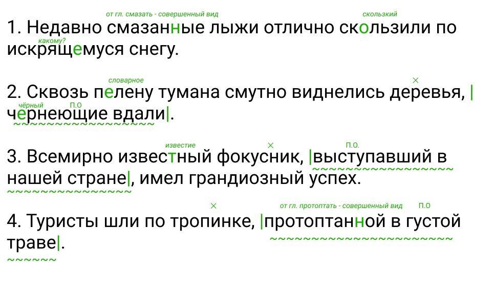 1. Недавно смазан..ые лыжи отлично ск..льзили по искрящ..муся снегу.