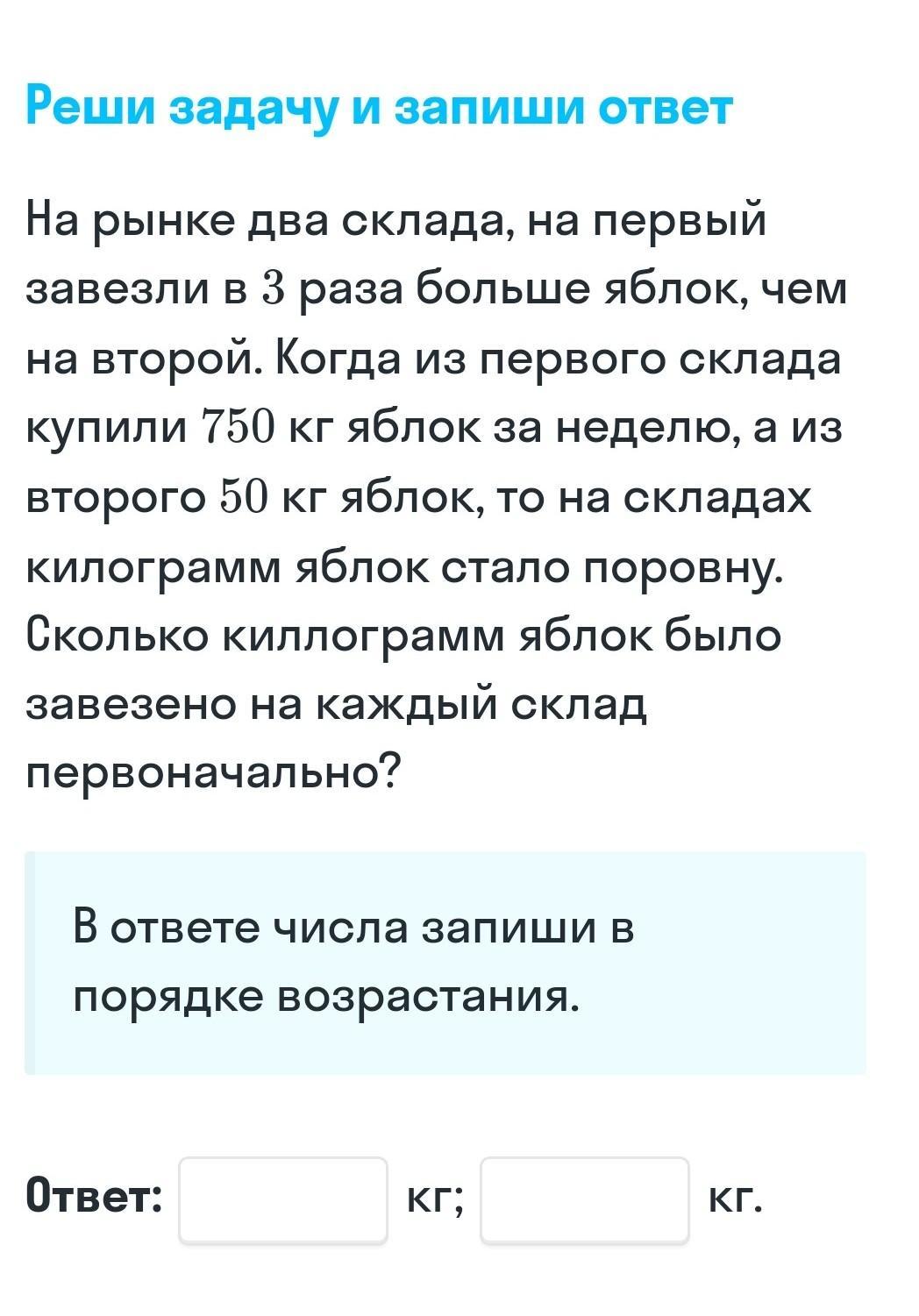 А значит: 3*350=1050 кг. на первом складе, а на втором складе 350 кг.