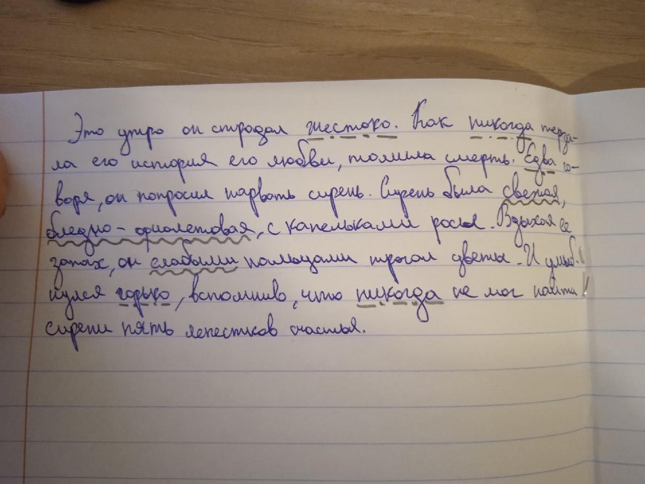Это утро он страдал жестоко. Как никогда терзала его история его любви, томила смерть. Едва говоря, он попросил нарвать сирень. Сирень была свежая, бледно-фиолетовая, с капельками росы. Вдыхая ее запах, он слабыми пальцами трогал цветы. И улыбнулся горько, вспомнив ,что никогда не мог найти сирени пяти лепестков счастья.