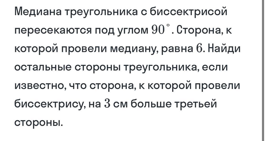 СРОЧНО!!!медиана треугольника с биссектрисой пересекаются под углом 90 градусов . сторона к которой провели медиану , равна 6 . найди остальные стороны треугольника , если известно , что сторона к которой провели биссектрису , на 3 см больше третьей стороны