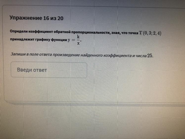 \displaystyle\bf\\y=\frac{k}{x} \\\\\\T\Big(0,3 \ ; \ 2,4\Big) \  \  \ \Rightarrow \  \  \ x=0,3 \  \ ; \  \ y=2,4\\\\\\2,4=\frac{k}{0,3}\\\\\\k=2,4\cdot0,3=0,72\\\\\\0,72\cdot25=18\\\\\\Otvet:18}