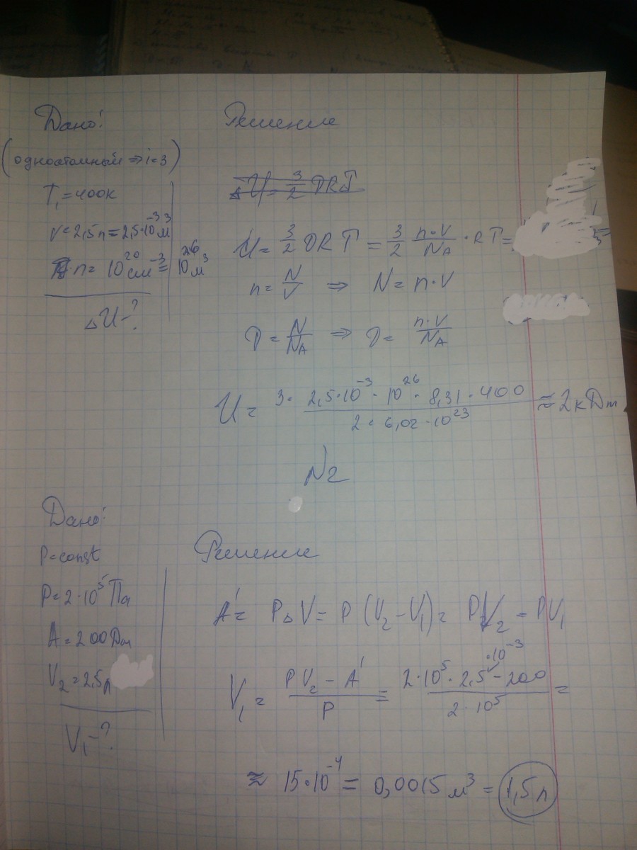 Какова внутренняя энергия одноатомного идеального газа занимающего при температуре 400К объём 2,5л, если концентрация его молекул 10 в 20 степени см. в -3 степени?