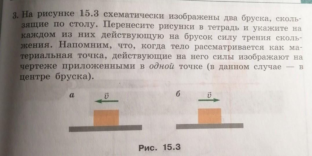 На рисунке 15.3 схематически изображены два бруска, сколь зящие по столу. Перенесите рисунки в тетрадь и укажите на каждом из них действующую на брусок силу трения сколь- жения. Напомним, что, когда тело рассматривается как ма- териальная точка, действующие на него силы изображают на чертеже приложенными в одной точке (в данном случае центре бруска).