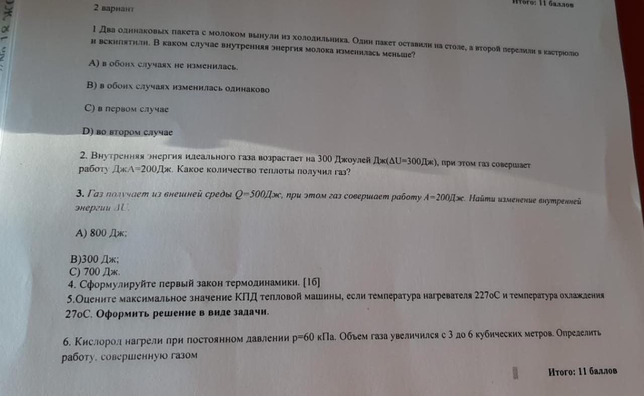 4)Пе́рвое нача́ло термодина́мики — один из основных законов этой дисциплины, представляющий собой конкретизацию общефизического закона сохранения энергии для термодинамических систем, в которых необходимо учитывать термические, массообменные и химические процессы