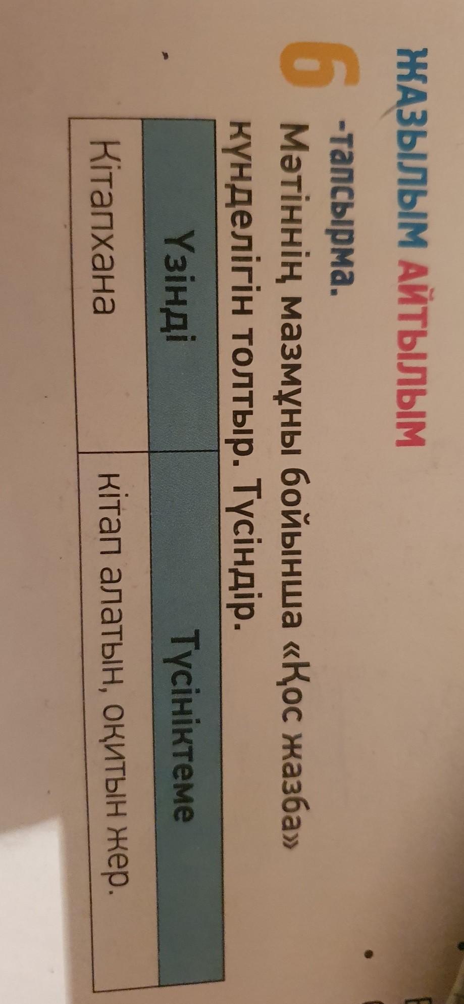 ЖАЗЫЛЫМ АЙТЫЛЫМ 6 -тапсырма. Мәтіннің мазмұны бойынша «Қос жазба» күнделігін толтыр. Түсіндір. Үзінді Түсініктеме Кітапхана кітап алатын, оқитын жер.