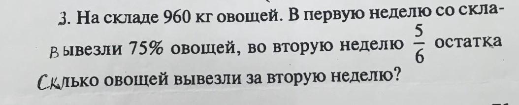 2) 240 * 5/6 = 200 (кг) - вывезли со склада во 2-ую неделю
