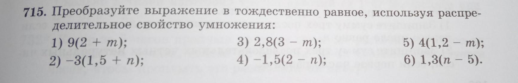 715. Преобразуйте выражение в тождественно равное, используя распре- делительное свойство умножения: 3) 2,8(3 – m); 5) 4(1,2 - m); 2) -3(1,5 + n); 4) -1,5(2 - n); 6) 1,3(n - 5). 1) 9(2 + т);