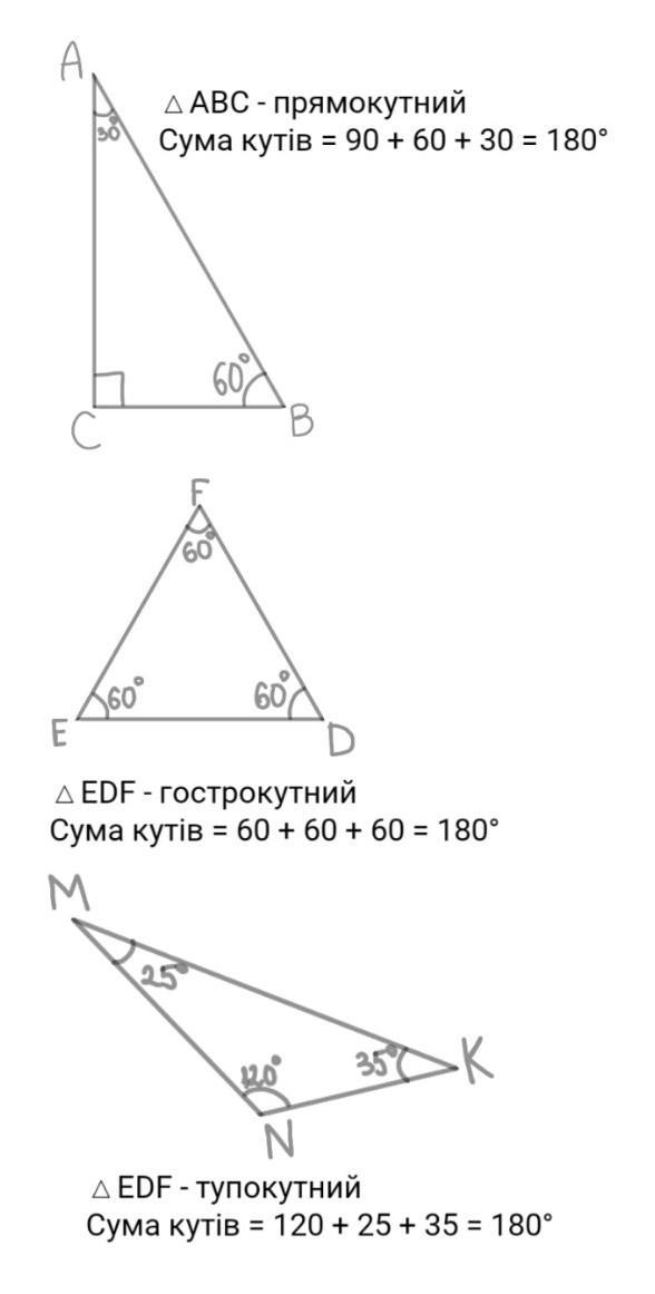 Накресліть прямокутний, гострокутний і тупокутний трикутники та виміряйте їхні кути. Знайдіть суму кутів кожного трикутника.