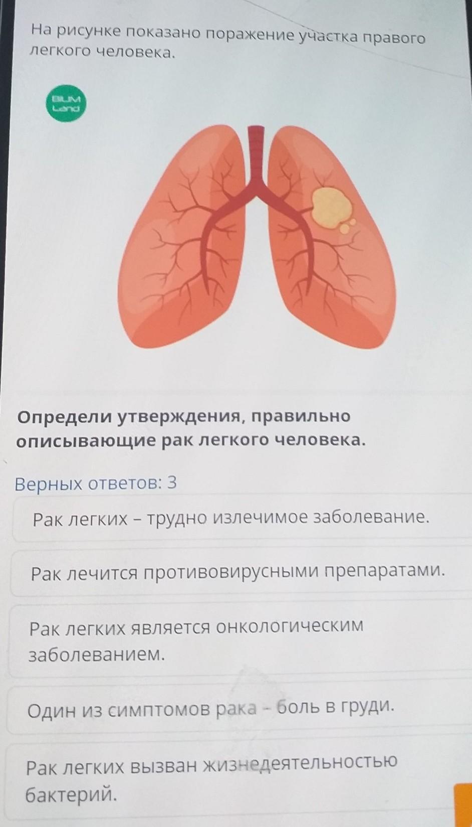 Определи утверждения, правильно описывающие рак легкого человека. Верных ответов: 3 Рак легких - трудно излечимое заболевание. Рак лечится противовирусными препаратами. Рак легких является онкологическим заболеванием. Один из симптомов рака – боль в груди. Рак легких вызван жизнедеятельностью бактерий.