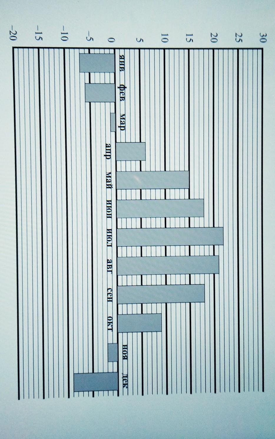 На диаграмме показана средняя дневная температура в каждом месяце в городе Эдмонтон. На вертикальной оси указана температура в градусах Цельсия, на горизонтальной-месяцы.