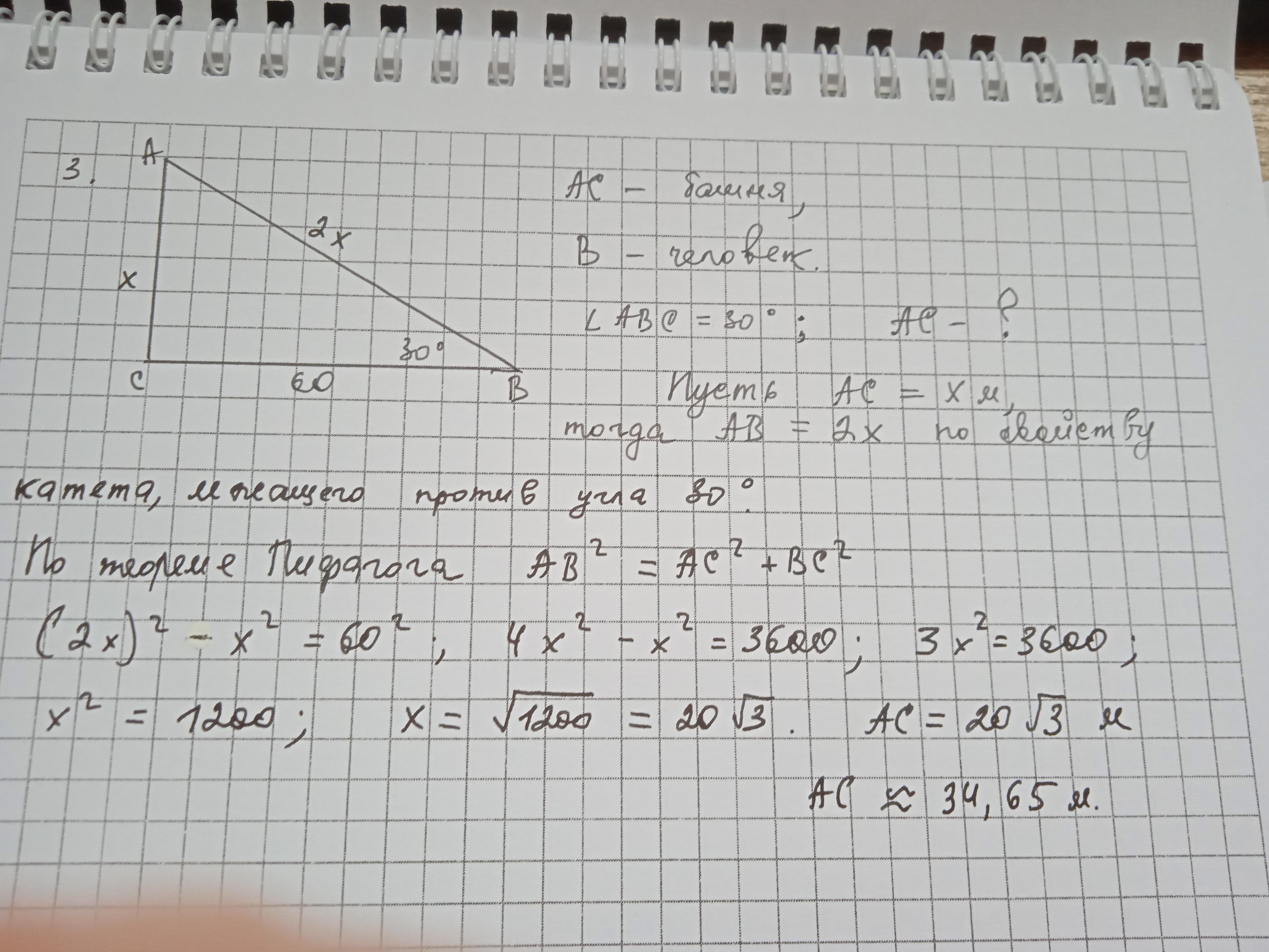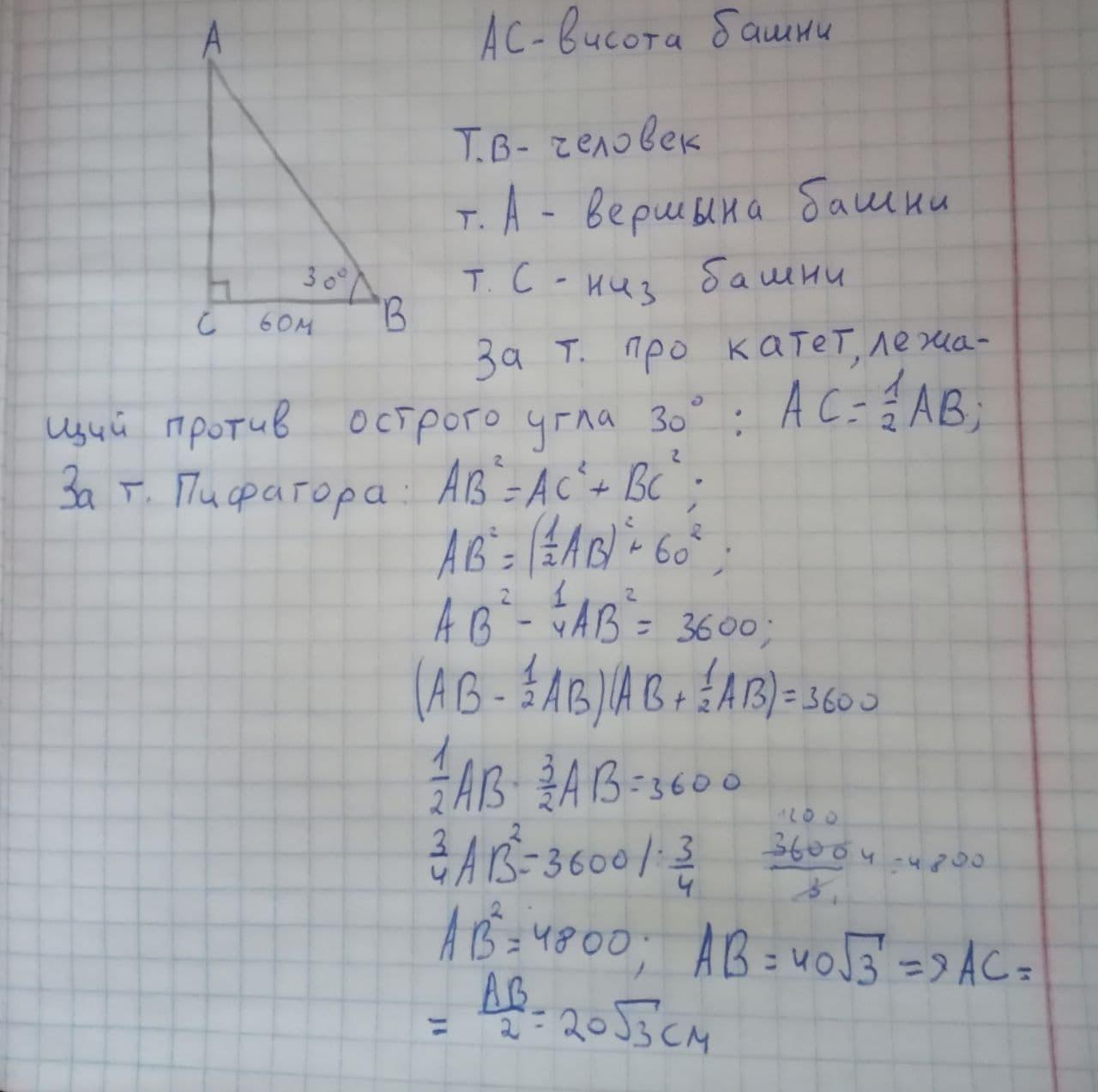 От башни на расстоянии 60м стоит человек и он смотрит на вершину башни с 30 градусным углом. Найдите высоту башни