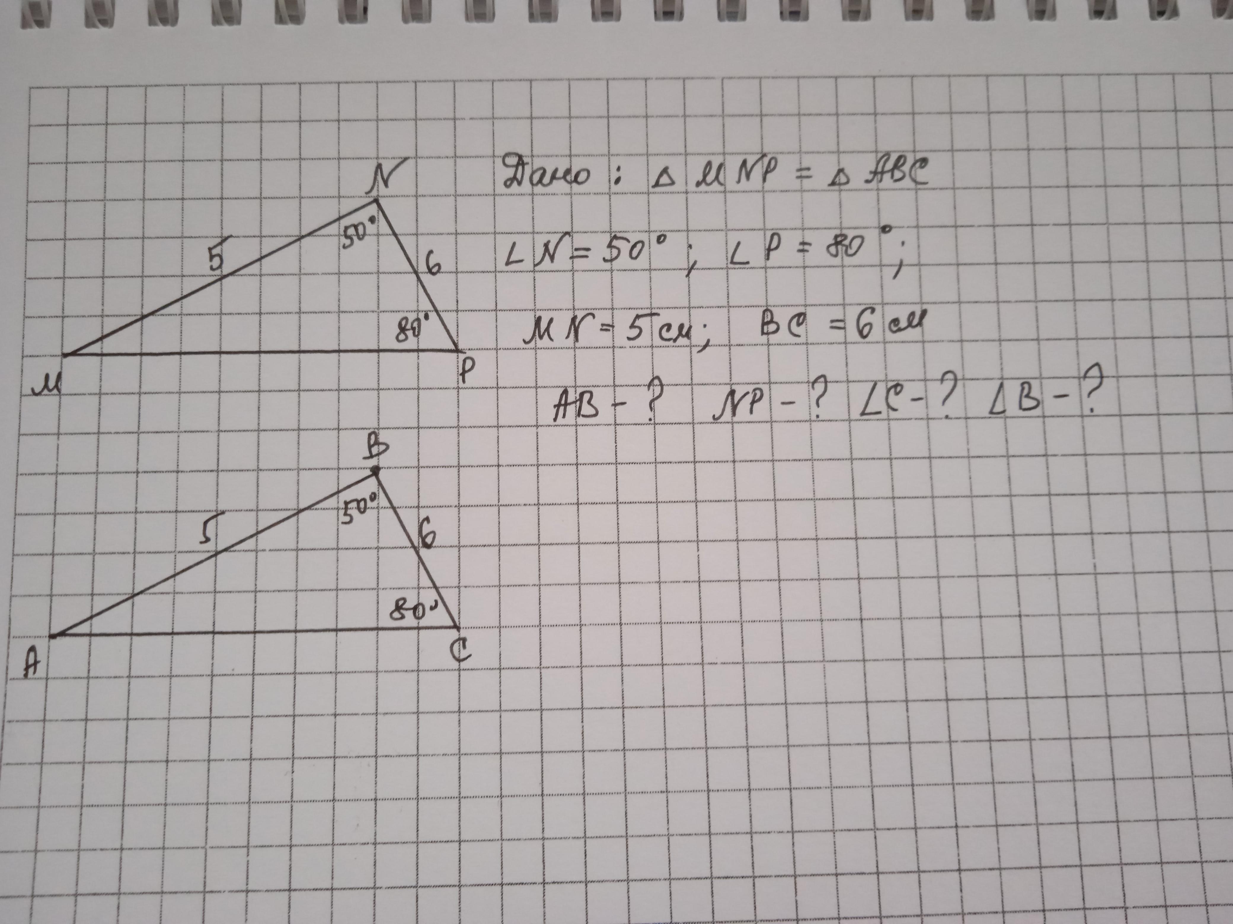 Даны равные треугольники MNP и ABC. Найдите AB;NP;угол C;угол B. Если BC=6см;MN=5см;угол N равен 50 градусам; угол P 80 градусам