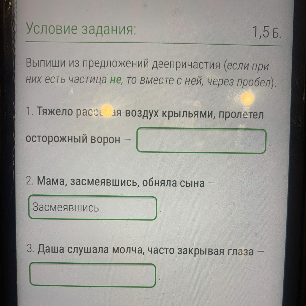 Объяснение: деепричастия отвечают на вопрос ‘что делая ?’. 1 - тяжело ( что делая ? ) рассекая воздух крыльями, пролетел осторожный ворон. 2 - мама ( что делая ? ), засмеявшись, обняла сына. 3 - даша слушала молча, часто ( что делая ? ) закрывая глаза