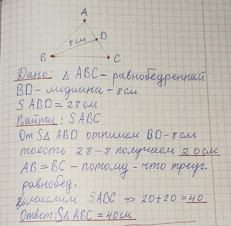 В равнобедренном треугольнике АВС медиана BD=8cм. Если периметр ABD равен 28 см,то периметр треугольника АВС равен а)40см б)50см в)20см г)36см