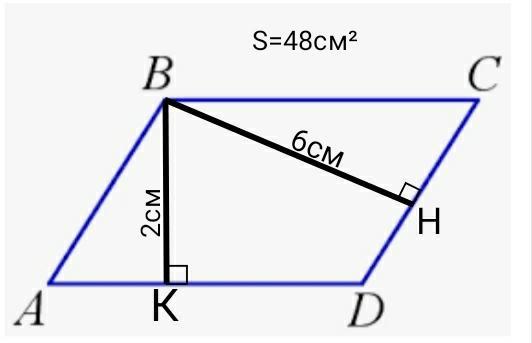 Высоты параллелограмма равна 2 см и 6 см а его площадь равна 48 см в квадрате Найдите стороны параллелограмма.