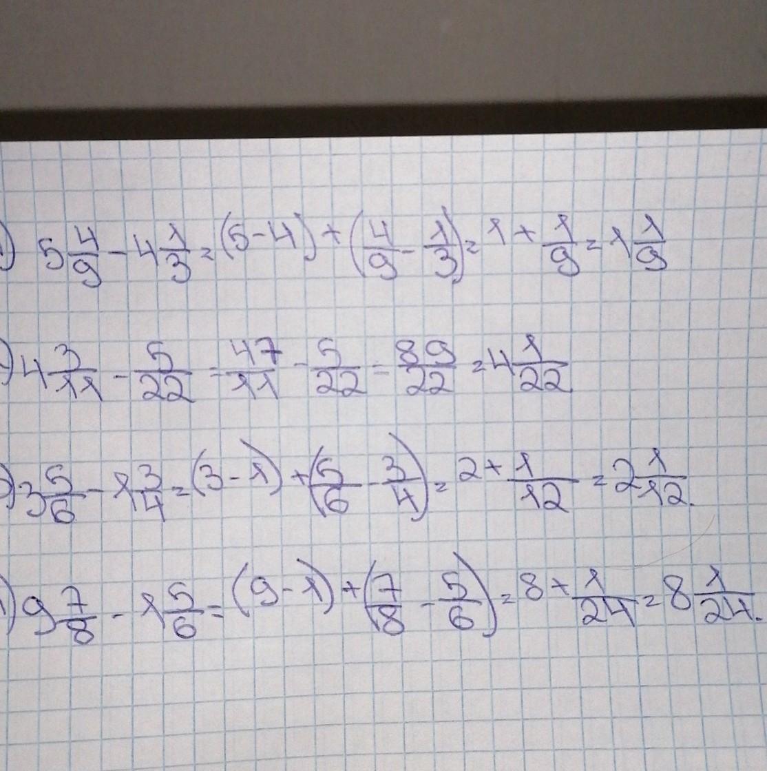 выполните действия 1) 5 8/9 - 4 1/3 2) 4 3/11 - 5/22 3) 3 5/6 - 1 3/4 4) 9 7/8 - 1 5/6
