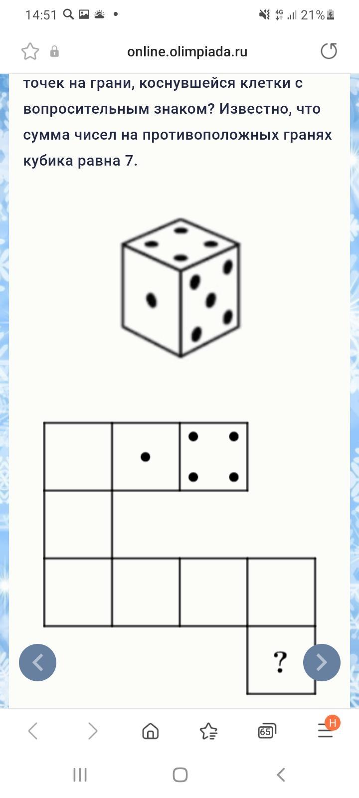 Игральный кубик покатили по столу. На рисунке изображён след кубика. Сколько точек на грани, коснувшейся клетки с вопросительным знаком? Известно, что сумма чисел на противоположных гранях кубика равна 7.