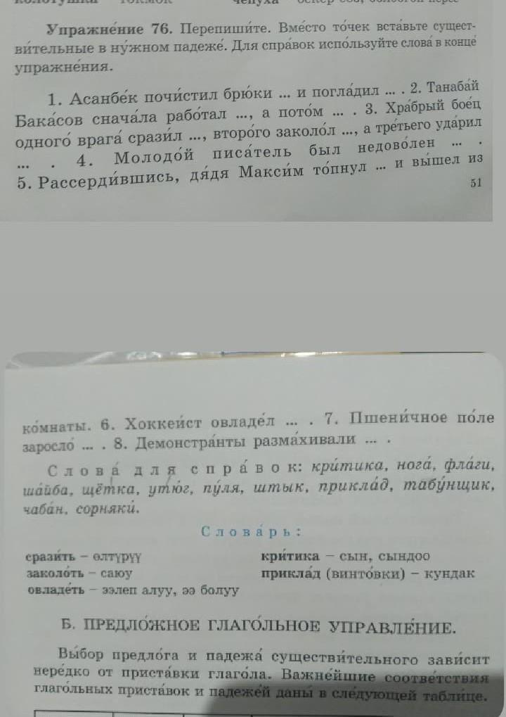 Ответ: Асанбек почистил брюки щёткой и погладил утюгом.Танабай Бакасов сначала работал табунщиком,а потом чабаном.Храбрый боец одного врага сразил пулей,второго заколол штыком,а третьего ударил прикладом.Молодой писатель был недоволен критикой.Рассердившись,дядя Максим топнул ногой и вышел из комнаты.Хоккеист овладел шайбой.Пшеничное поле заросло сорняками.Демостранты размахивали флагами.