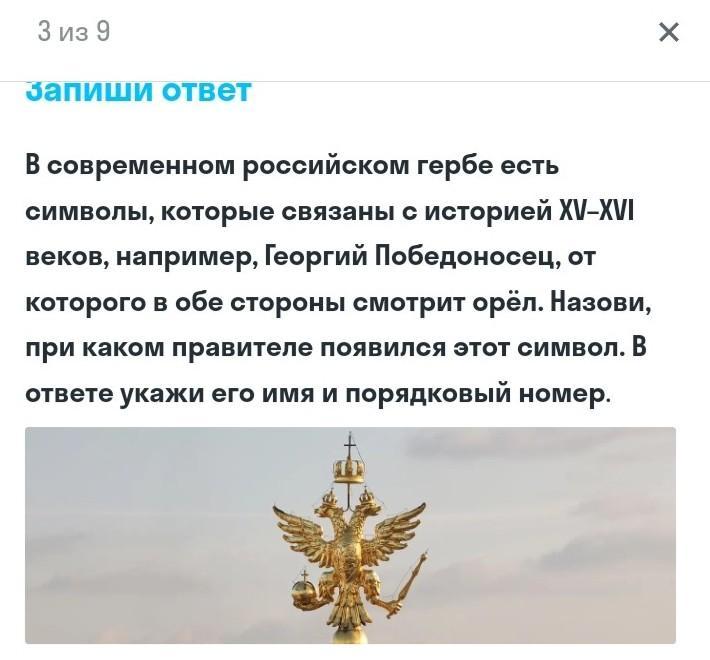 Правильный ответ Иван III. Он женился на племяннице византийского императора Софье Палеолог и в наследство от Византии получил двуглавого орла.