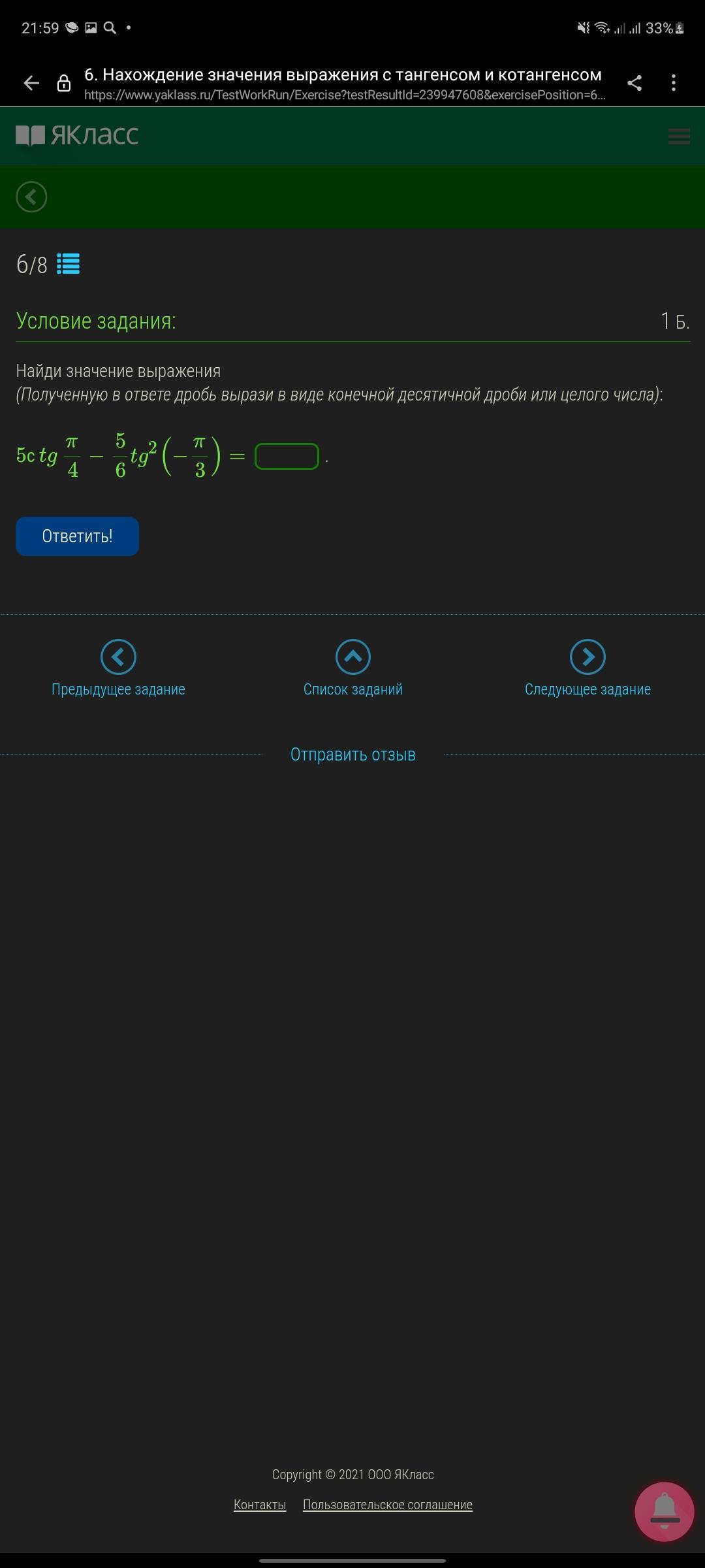 5 ctg(\frac{\pi}{4} )-\frac{5}{6} tg^2(-\frac{\pi}{3}) = 5 \times 1 - \frac{5}{6} \times 3}= 5 - \frac{5}{2} = \frac{5}{2}  = 2.5