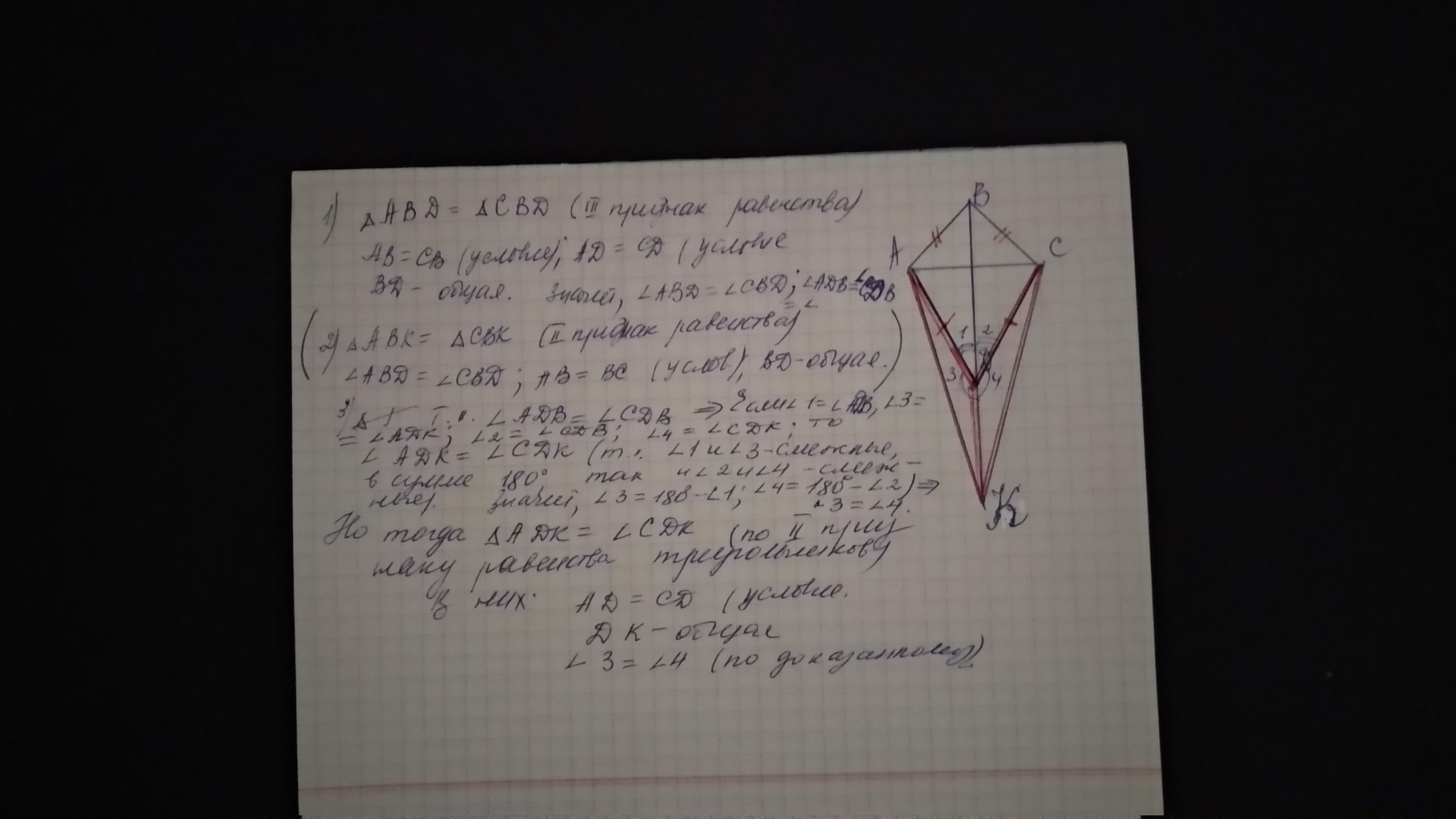 Вершины B и D треугольников ABC и ADC лежат в разных полуплоскостях относительно прямой АС, АВ = ВС, AD = DC. Точка К лежит на луче BD так, что точка D лежит между точками B и K. Докажите, что треугольники ADK и СDK равны.