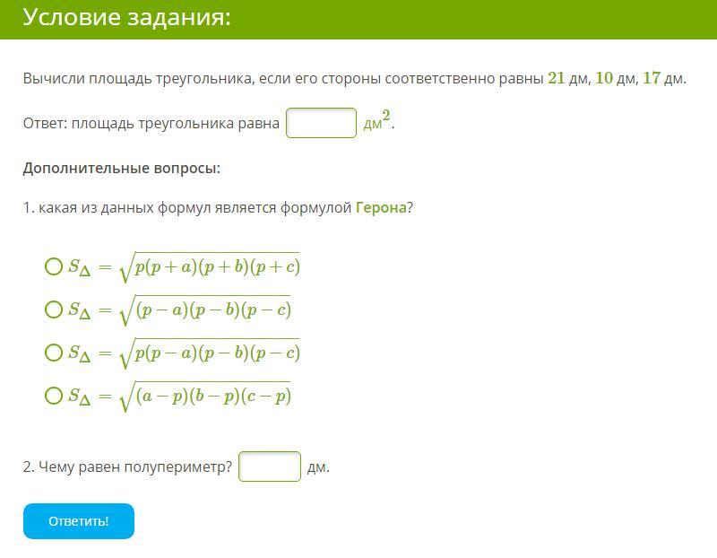 если треугольник со сторонами 21 дм, 10 дм и 17 дм, то полупериметр равен (21+10+17)/2=24дм