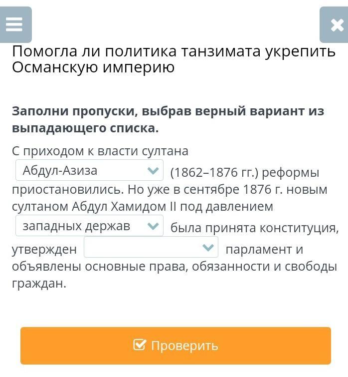 С приходом к власти султана ________ (1862-1876 гг.) реформы приостановились. Но уже в сентябре 1876 г. Новым султаном Абдул Хамидом II под давлением ___________ была принята конституция, утвержден __________ парламент и объявлены основные права, обязанности и свободы граждан. С Проверить