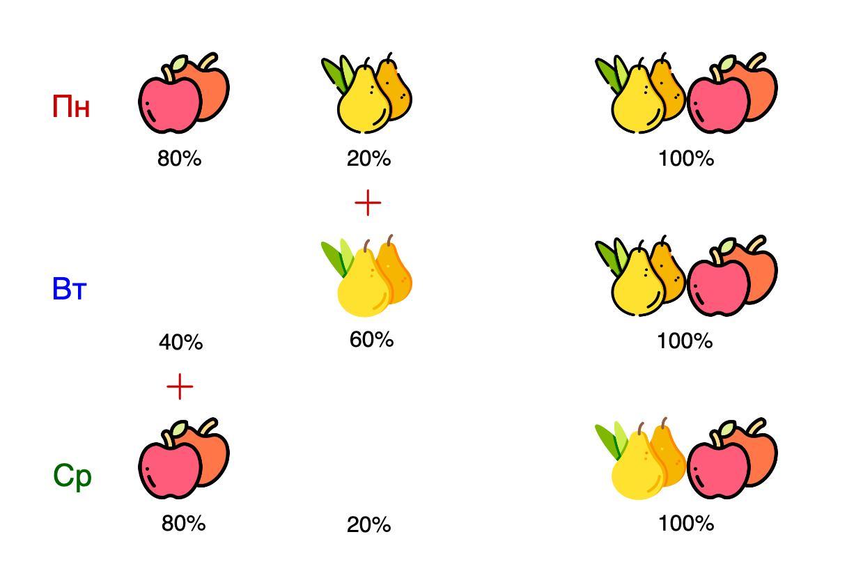 В понедельник на склад магазина привезли яблоки и груши, упакованные в ящики. Яблок было 80%. Во вторник довезли еще груши, после чего яблок стало 40%. А в среду привезли яблок, и их снова стало 80%. Во сколько раз увеличилось суммарное количество яблок и груш за эти 3 дня?
