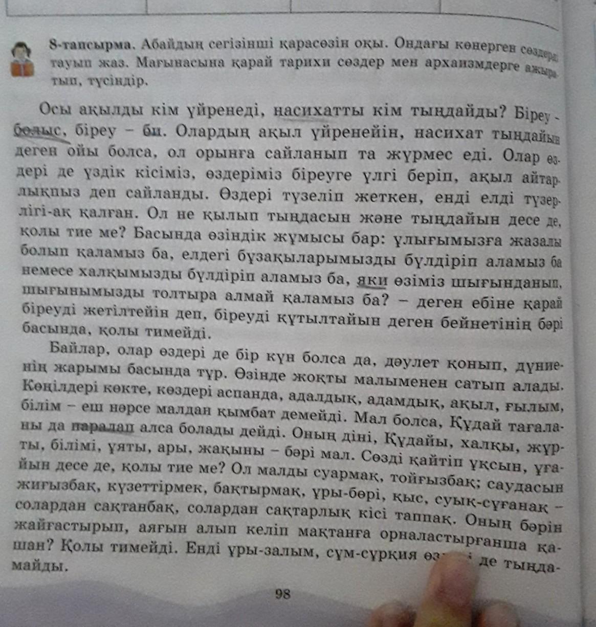 9-тапсырма. Мәтін бойынша кестені толтыр. Абайдың сегізінші қарасөзі Архаизмдер Дисфемизмдер Тарихи сөздер
