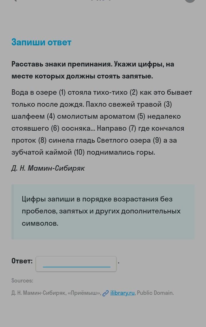 Вода в озере стояла тихо-тихо, (2) как это бывает после дождя. Пахло свежей травой, (3) шалфеем, (4) смолистым ароматом недалеко стоявшего сосняка. Направо, (7) где кончался поток, (8) синела гладь Светлого озера, (9) а за зубчатой каймой поднимались горы.