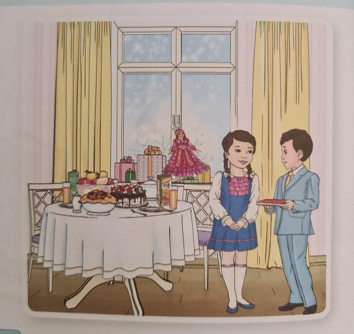 Мы видим картинку на которых изображают день рождения девочки. Стоит нарядно красивая девочка одетая в синий сарафанчик ,в белой рубашке, в голубых балетках. Рядом стоит мальчик, который по-видимому дарит ей коробку конфет. На столе стоит много угощений; торт ,сок, фрукты . На подоконнике стоит много подарков , в том числе очень красивая кукла . Мне очень понравилась эта картинка она передаёт все прекрасное этого праздника!
