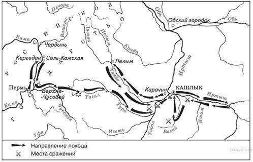 Напишите правителя государства, которое было присоединено к России в ходе похода, показанного на карте. Напишите название государства, присоединение которого к Российскому государству представлено на карте.