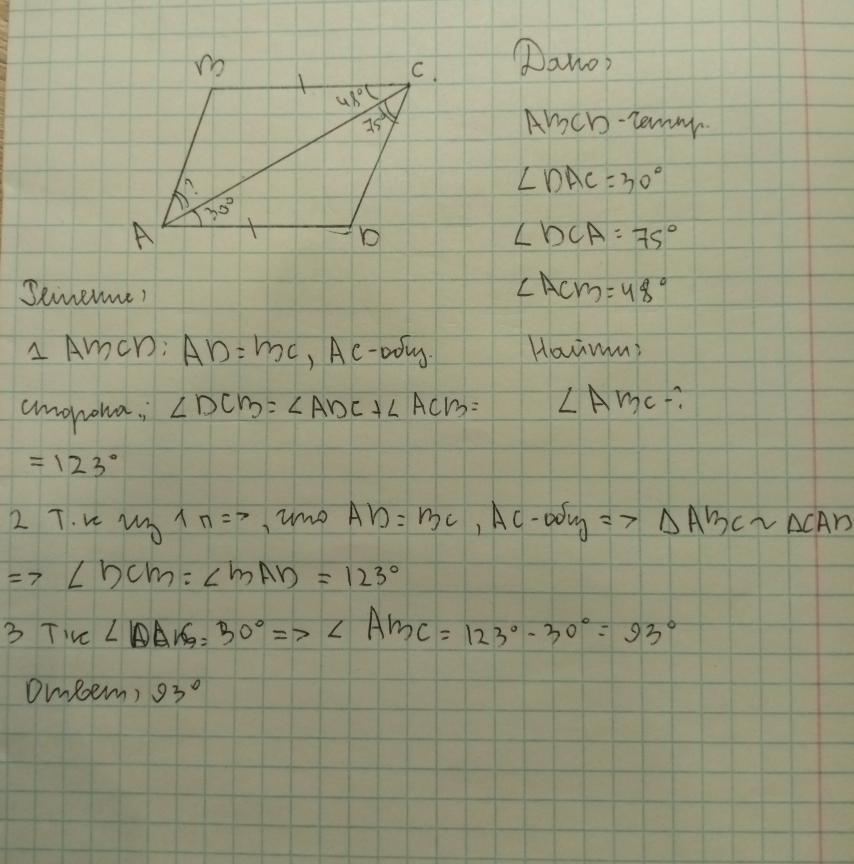 В четырехугольнике ABCD стороны AD и BC равны, угол DAC =30 градусов угол DCA= 75 градусов, угол ACB= 48 градусов. Чему равен угол ABC?